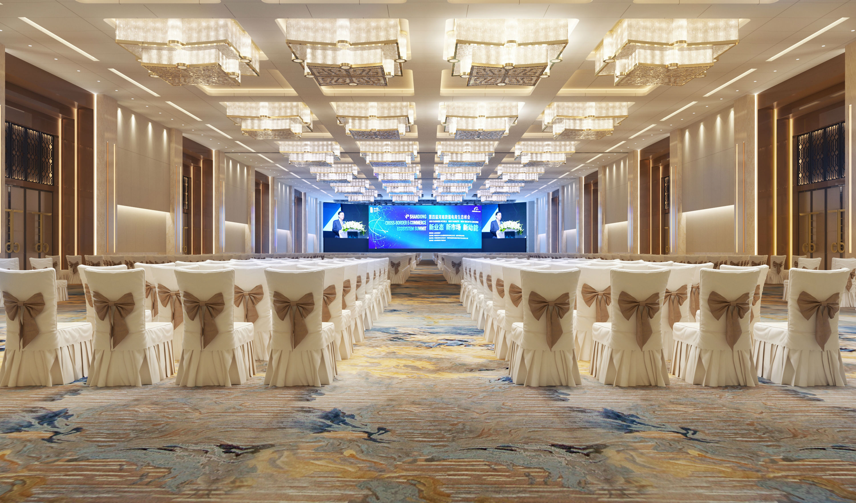 奧體中心展覽廳位于鄭州市奧林匹克體育中心游泳館下方,緊鄰鄭州“四個(gè)中心”中央大街,總建筑面積約8500平方米,包含3000平方米展覽廳、大堂前廳、設(shè)備房等配套設(shè)施工程。項(xiàng)目整體設(shè)計(jì)理念取“黃河天水”及“商合”之意,采用了大量的“黃河”及“商都”兩大彰顯地域特色的設(shè)計(jì)元素,表現(xiàn)出韻味十足的鄭州商都文化特色,同時(shí)又兼具現(xiàn)代會(huì)展會(huì)務(wù)的簡(jiǎn)約風(fēng)格。