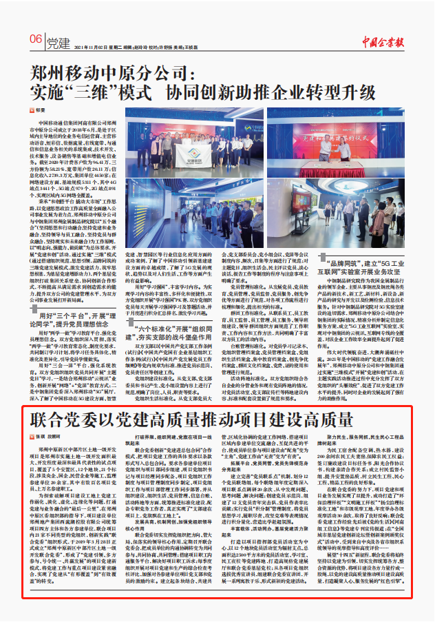 西流湖公司始終堅持“抓好黨建就是最大的政績”,創(chuàng)新“黨建進總包合同”合作模式,貫徹落實“支部建在項目上,黨旗飄在工地上”的工作思路,以中原新區(qū)中部片區(qū)土地一級開發(fā)聯(lián)合黨委和項目黨支部建設為抓手,以“12343”黨建工作體系為指引,讓黨的主張、黨的作風、黨組織的力量在項目建設中處處彰顯,充分激發(fā)黨員的先鋒模范作用和黨組織的堅強堡壘作用,將黨建轉(zhuǎn)化為生產(chǎn)力,真正實現(xiàn)黨建促發(fā)展的“紅色引擎”作用。公司黨建工作先進經(jīng)驗榮登《中國企業(yè)報》,意味著公司黨建工作先進經(jīng)驗對于全國企業(yè)黨建具有良好的借鑒意義,標志著公司黨建工作及宣傳水平再上新臺階。